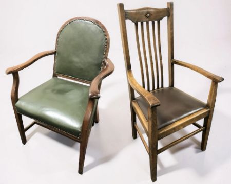 An Edwardian oak armchair and a further armchair with studded green leather seat. (2)
