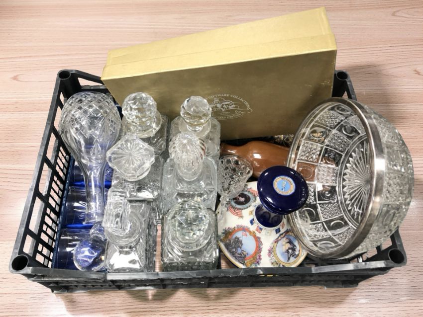 Assorted glass decanters, a Pusser's navy rum decanter (empty), other boxed glass wares, etc. (1 box)
