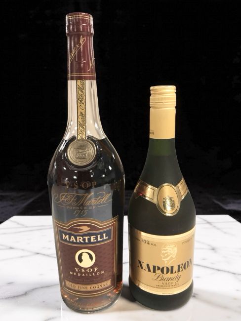 A 1 litre bottle of Martel VSOP Medaillon Old Fine cognac, and a further 70 cl bottle of Napoleon brandy VSOP.