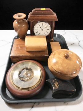 A quartz mantel timepiece, circular barometer, a Japanese lacquer trinket box, other treen items.