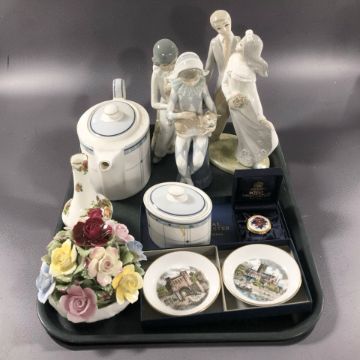 Assorted cabinet china, Nao figures, Royal Worcester enameled pill box, Royal Albert, etc.