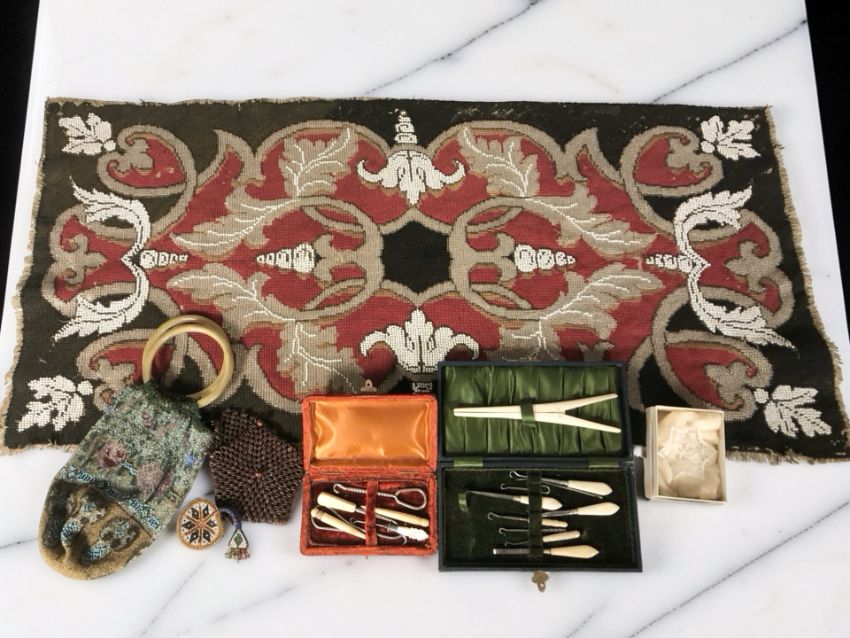 A group of decorative beadwork items including a purse, a cased necessaire, plus another.