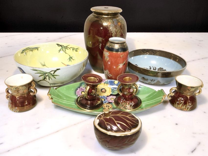 A Crown Devon Fieldings chinoiserie lustre lamp base, similar pair of twin handled vessels, pair of squat candlesticks, a Carlton Ware rouge royale preserve pot, Carlton Ware fruit bowl on blue ground, further vase on red ground, an oval shallow bowl and a fruit bowl depicting kingfishers.