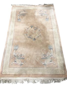 A Chinese woolen rug on pink ground decorated with dragons, 261 cm x 154 cm.