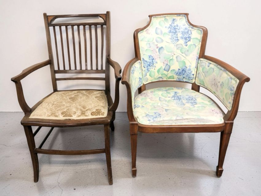 An Edwardian inlaid mahogany armchair and a further armchair in floral fabric.