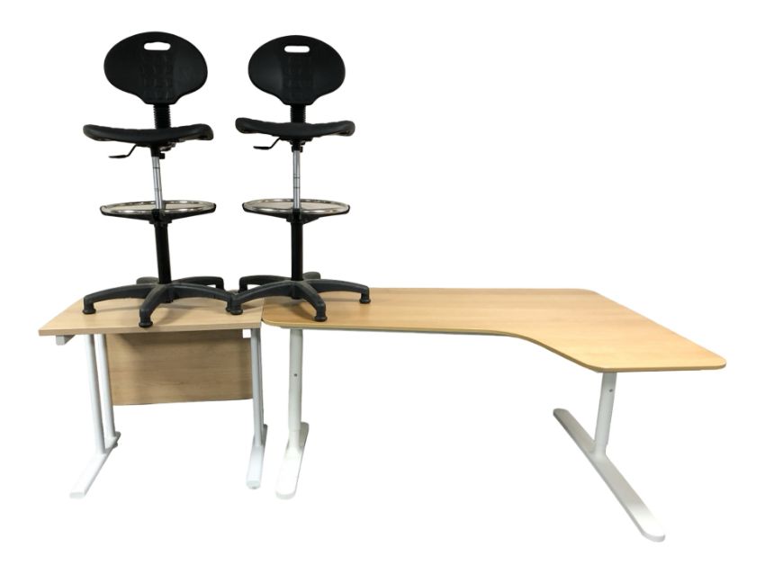 A modern computer desk / workstation, length 161 cm, a further desk and two swivel adjustable chairs.