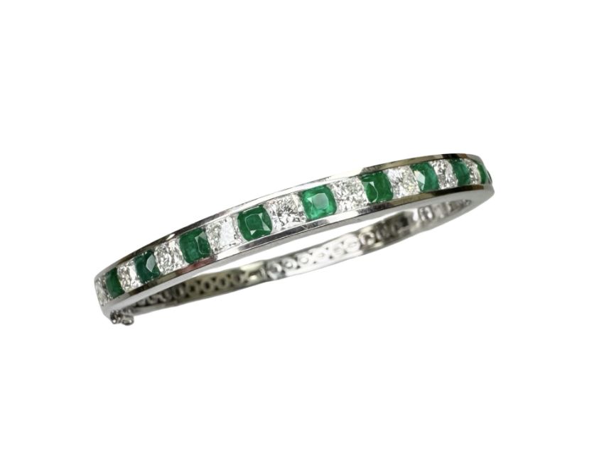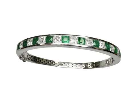 A fine 18ct white gold emerald and diamond bangle, set with twelve cushion-shaped diamonds and twelve emeralds, the total diamond weight estimated to be 4.80 carats, inner diameter 6cm. CONDITION REPORT: 35.8g.