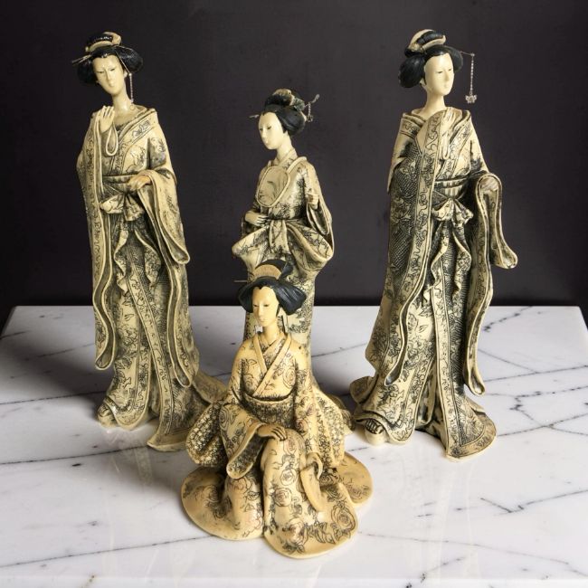 Four Japanese resin and pen work figures of geishas, tallest 41 cm.