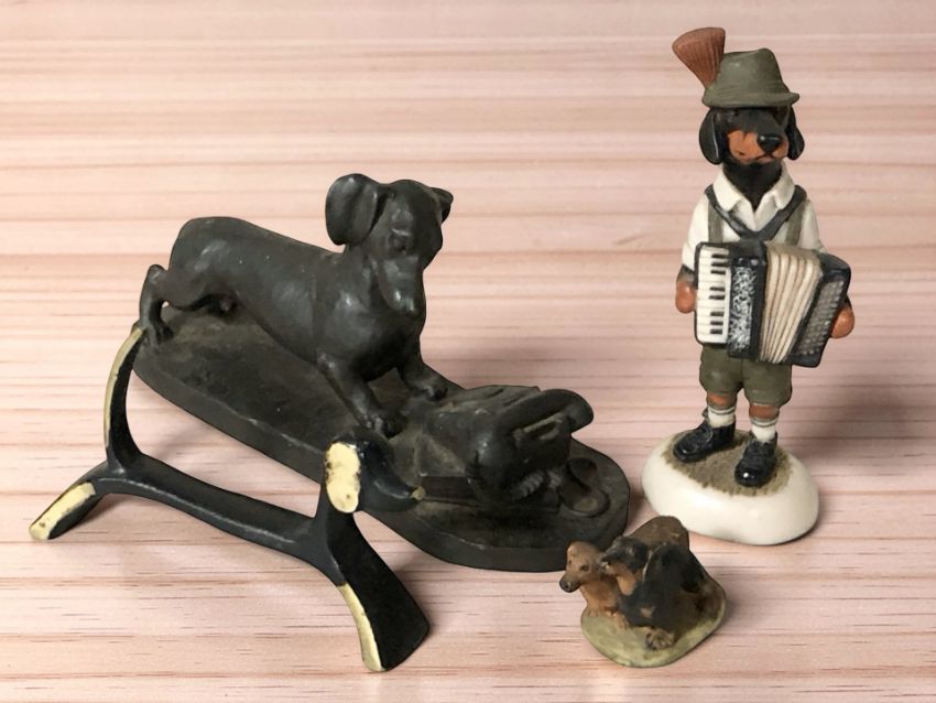 A Robert Harrop dog figure, plus three further dachshund ornaments.