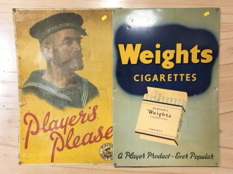 Two reproduction enameled tin signs 'Players Please' and 'Weights Cigarettes', each 74 cm x 50 cm.