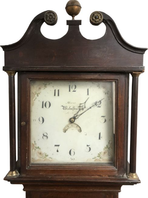 An early 19th century oak thirty hour long case clock, with painted 12" dial signed 'Morse Malmsbury', with pendulum and weight, height 212 cm.
