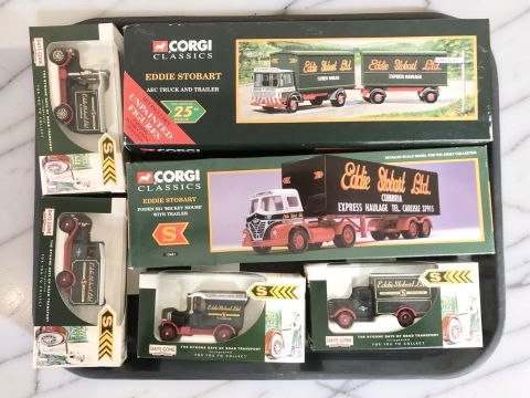 Two Corgi Classics Eddie Stobart die cast models 97369 AEC truck and trailer, 13601 Foden S21 Mickey Mouse with trailer, together with four Days Gone Eddie Stobart delivery vans.