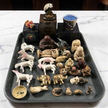 A group of oriental resin and pen work figures, other metal and porcelain animal ornaments, Spode millennium celebration votive candle, etc.
