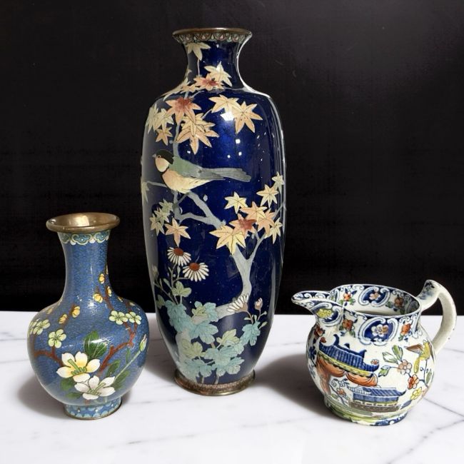 A Japanese Meiji period cloisonne enamel vase, height 24 cm, a further smaller vase, and a 19th century milk jug decorated with oriental scenes.