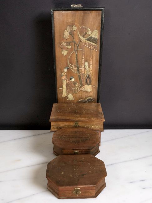 An oriental hardstone inlaid panel, height 49 cm, and three brass inlaid hardwood trinket boxes.