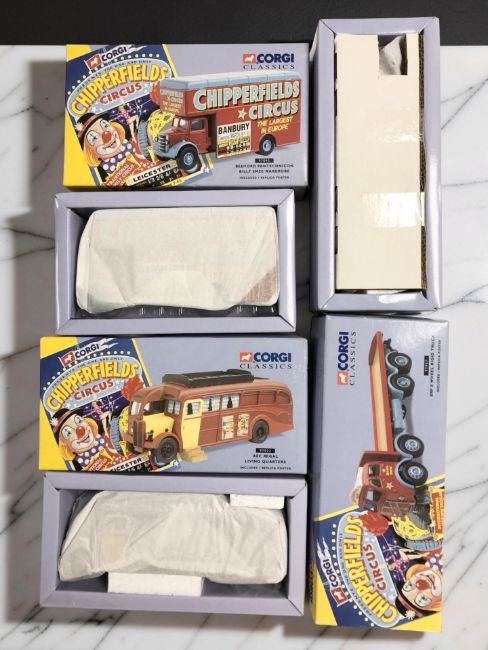 Three Corgi Classics Chipperfield Circus models 97957 ERF eight wheel rigid truck, 97022 AEC Regal living quarters, and 97092 Bedford Pantechnicon Billy Smee wardrobe.