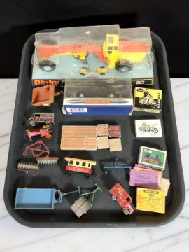 A Dinky Toys 963 road grader die cast model, a further Dinky boxed 1954 Ford V8 Pilot, and several further unboxed die cast and tin plate vehicles, building blocks, etc.
