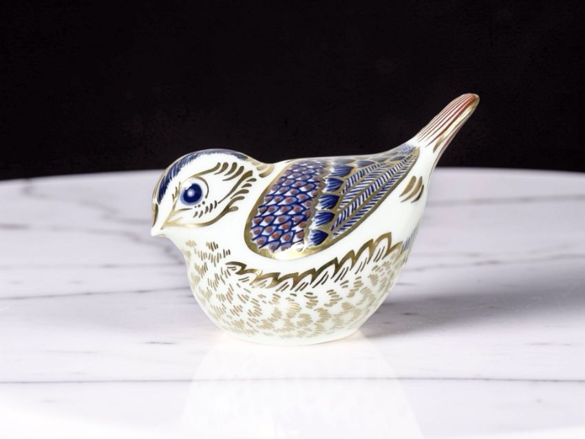 A Royal Crown Derby Goldcrest paperweight, with gold stopper and original box.
