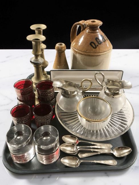A pair of Victorian brass candlesticks, stoneware flagon and bottle, glass wares, plated tea spoons, etc.