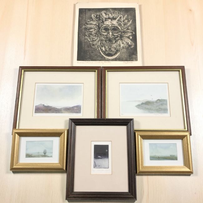A group of pictures and prints, a Rosie Harden-Vane monochrome print of the Durham Cathedral sanctuary door knocker, two small continental watercolours, two Elizabeth Moore signed limited edition colour prints, each 11 cm x 16 cm, etc.