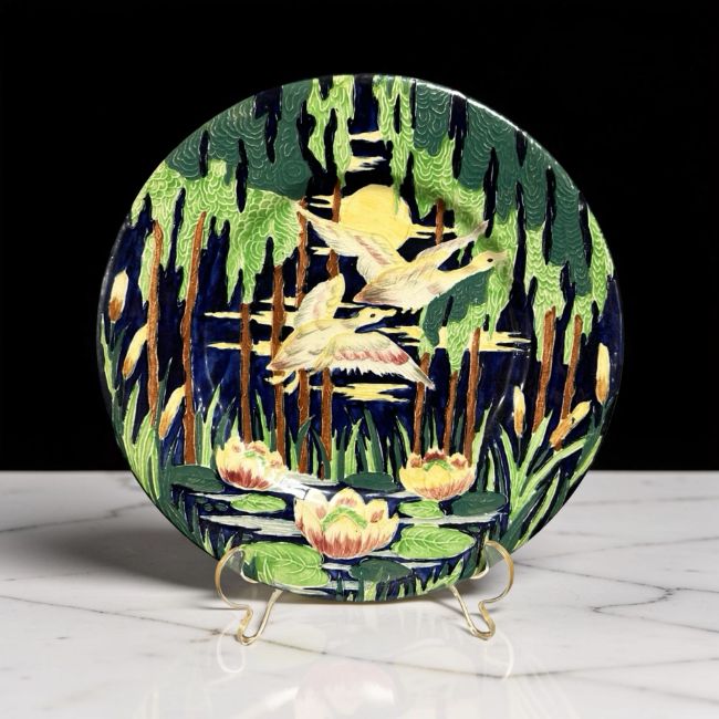A Maling lustre cabinet plate depicting geese in flight, diameter 29 cm.