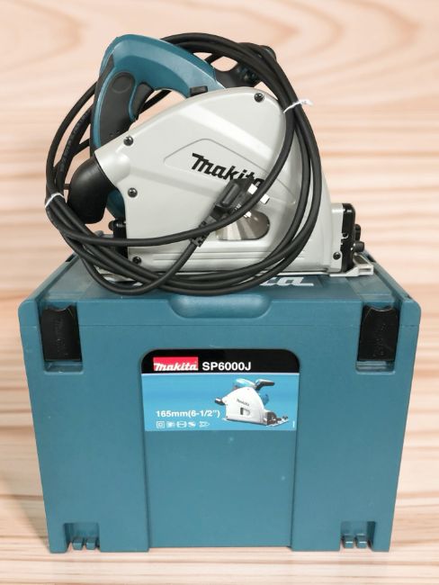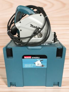 A Makita 165 mm SP6000 circular saw with box, together with a pair of Makita router boards.