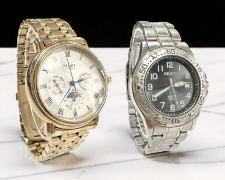 A gent's Stauer gold-plated automatic calendar wristwatch, case 40mm, and a stainless steel Seiko quartz calendar wristwatch, case 38mm