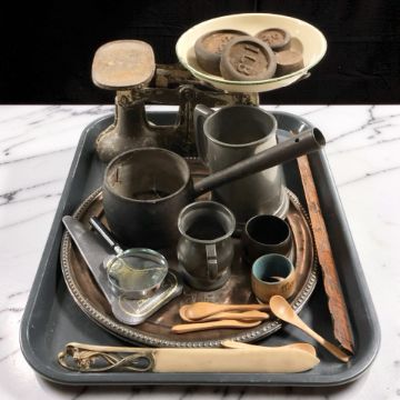 A set of scales with weights, other metal wares, letter openers, magnifying glass, pewter tankards, etc.
