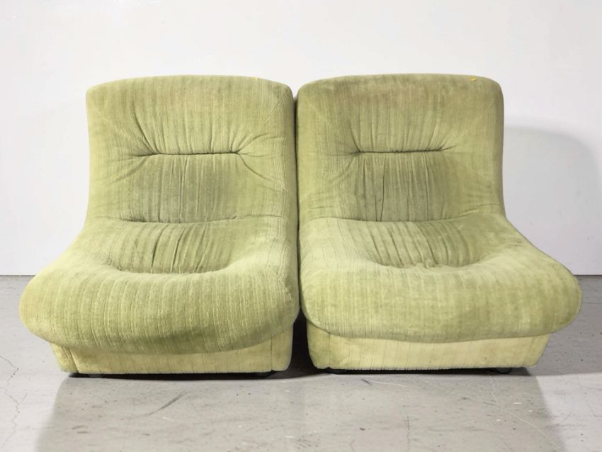 A pair of mid-century lounge chairs, in pale green upholstery, width 88 cm.