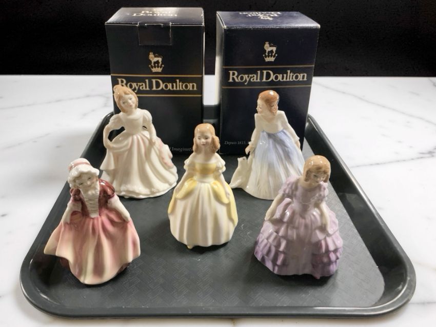 Five Royal Doulton figures comprising 'Rose' HN2123, 'Penny' HN2424, 'Dinky Doo' HN2120, 'Andrea' HN3058, and 'Amanda' HN2996.