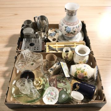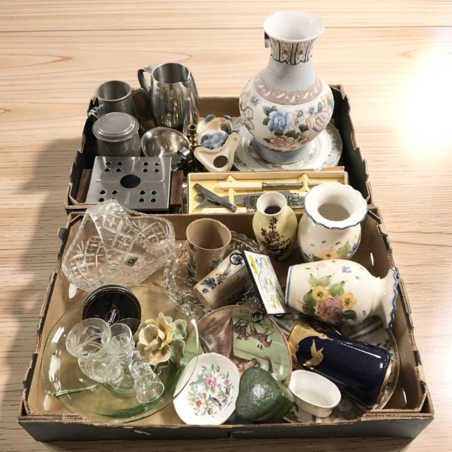Assorted ceramics, stainless steel and pewter wares, Edinburgh Crystal basket and other glass wares. (2 boxes)
