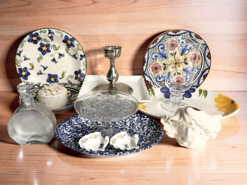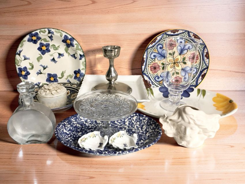 A group of contemporary dishes, glass wares, candle stand, etc. (1 box)