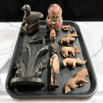 A group of wooden animal carvings, Russian babushka nesting doll, etc.