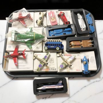 A group of Matchbox die cast vehicles including fighter aircraft, Thunderbirds, classic cars, etc.