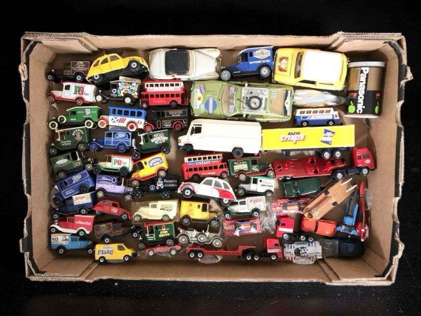 A quantity of unboxed die cast delivery vans, buses and other vehicles including Days Gone, etc. (1 box)