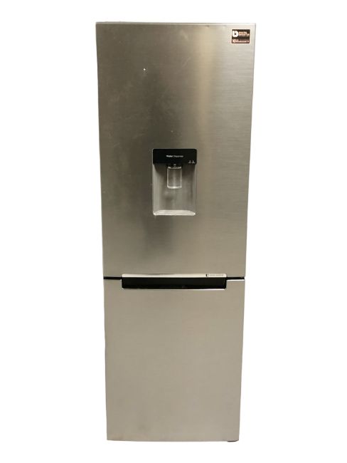 A stainless steel fridge freezer with water dispenser.