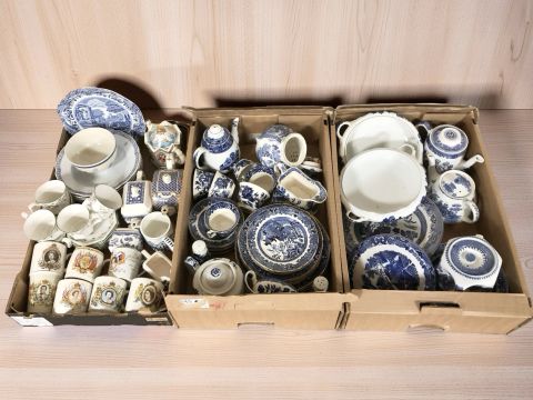 A collection of Willow pattern ceramics including Burleigh Ware, Myott, commemorative mugs, tea pots, Johnson brothers china, etc. (3 boxes)