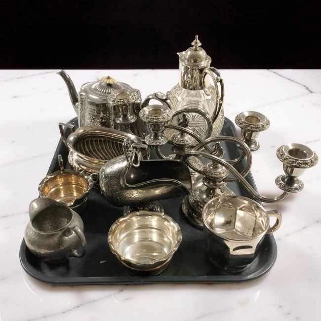 A group of EPNS and pewter items, ewer, pair of table candelabra, tea wares, etc.