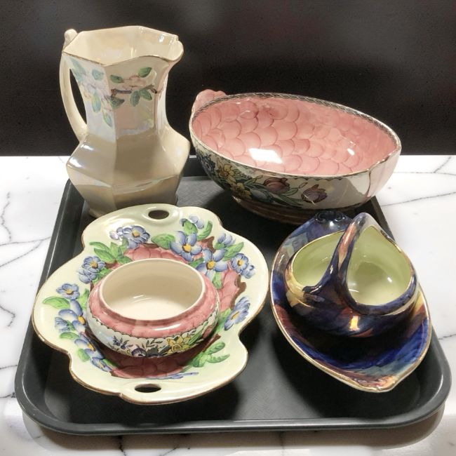 A group of Maling lustre ceramics including oval fruit bowl, storm basket and gondola dish, etc.