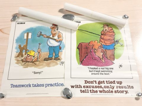 A group of unframed Herman posters.