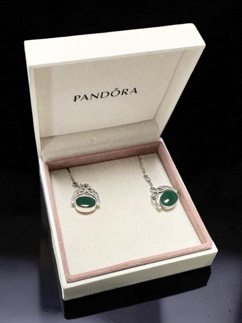 A pair of silver and green stone swivel fob earrings in an associated Pandora box.