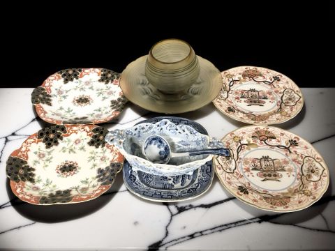 A group of blue and white willow pattern ceramics, ribbed glass vase and similar pedestal dish, Imari pattern dishes.