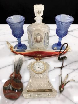 A Waterford Crystal mantel timepiece, a pair of Fostoria blue glass goblets, Italian studio glass items, decanter and stopper, etc.