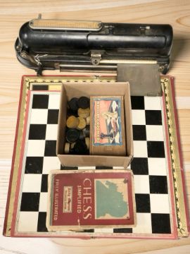 An early 20th century Halsby & Co Protectograph cheque writer, together with a group of chess piece, draughts, boards, etc.