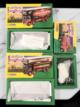 Three Corgi Classics The Showman's Range die cast models 12601 Foden closed pole truck set 'Silcock's of Warrington', 27801 Atkinson open pole truck set 'Anderton & Rowland's', and 16101 Scammell Highwayman crane set 'John Crow & Sons'.