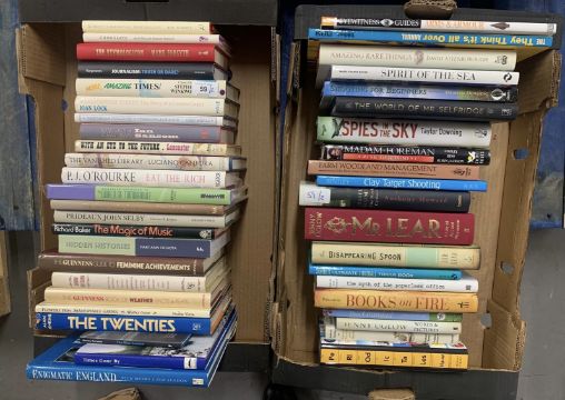 Two boxes containing forty four "Coffee Table" books relating to various subjects : 'Spies in the Sky' by Taylor Downing, 'The Magic of Music' by Richard Baker, 'The Disappearing Spoon' by Sam Kean, 'The Spirit of the Sea' by Marie-France Boyer, etc.