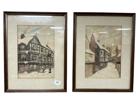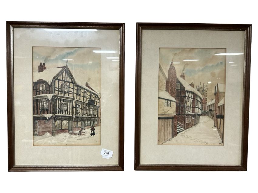 20th Century School : A naive painting of figures shovelling snow in the street, watercolour, 32 cm x 21 cm, together with a companion piece.