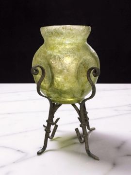 A Loetz iridescent glass dimpled vase on metal stand, overall height 15cm