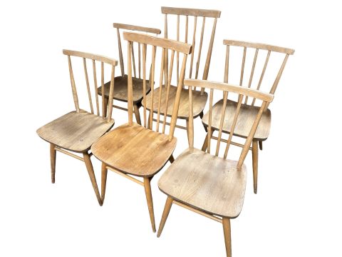 A set of four Ercol elm and beech model 391 spindle back dining chairs, plus a further slightly larger pair. (6)
