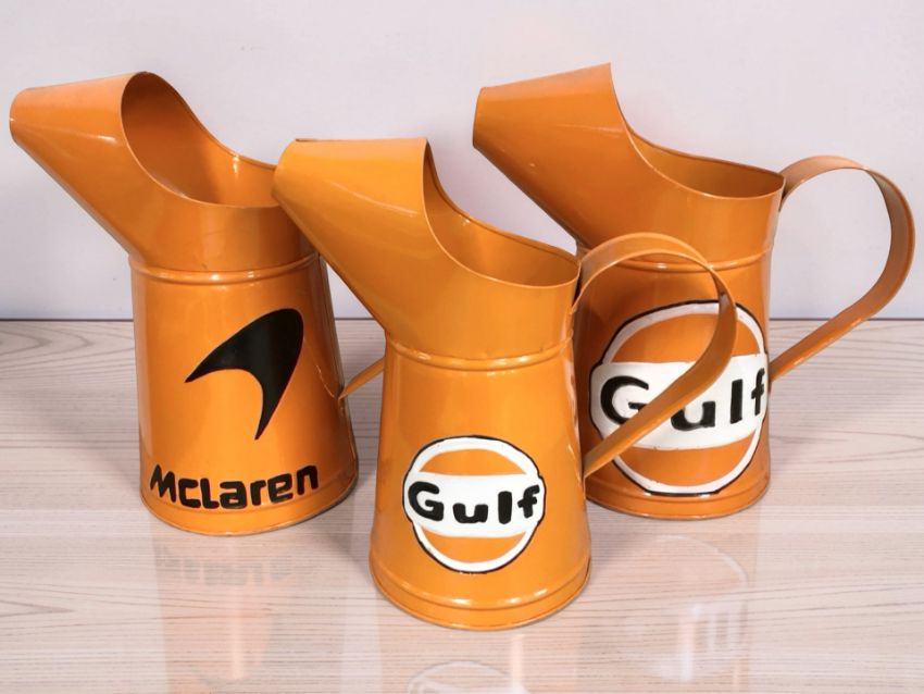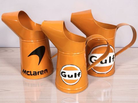 Three reproduction oil cans with Gulf and Mcclaren advertising, tallest 32 cm.